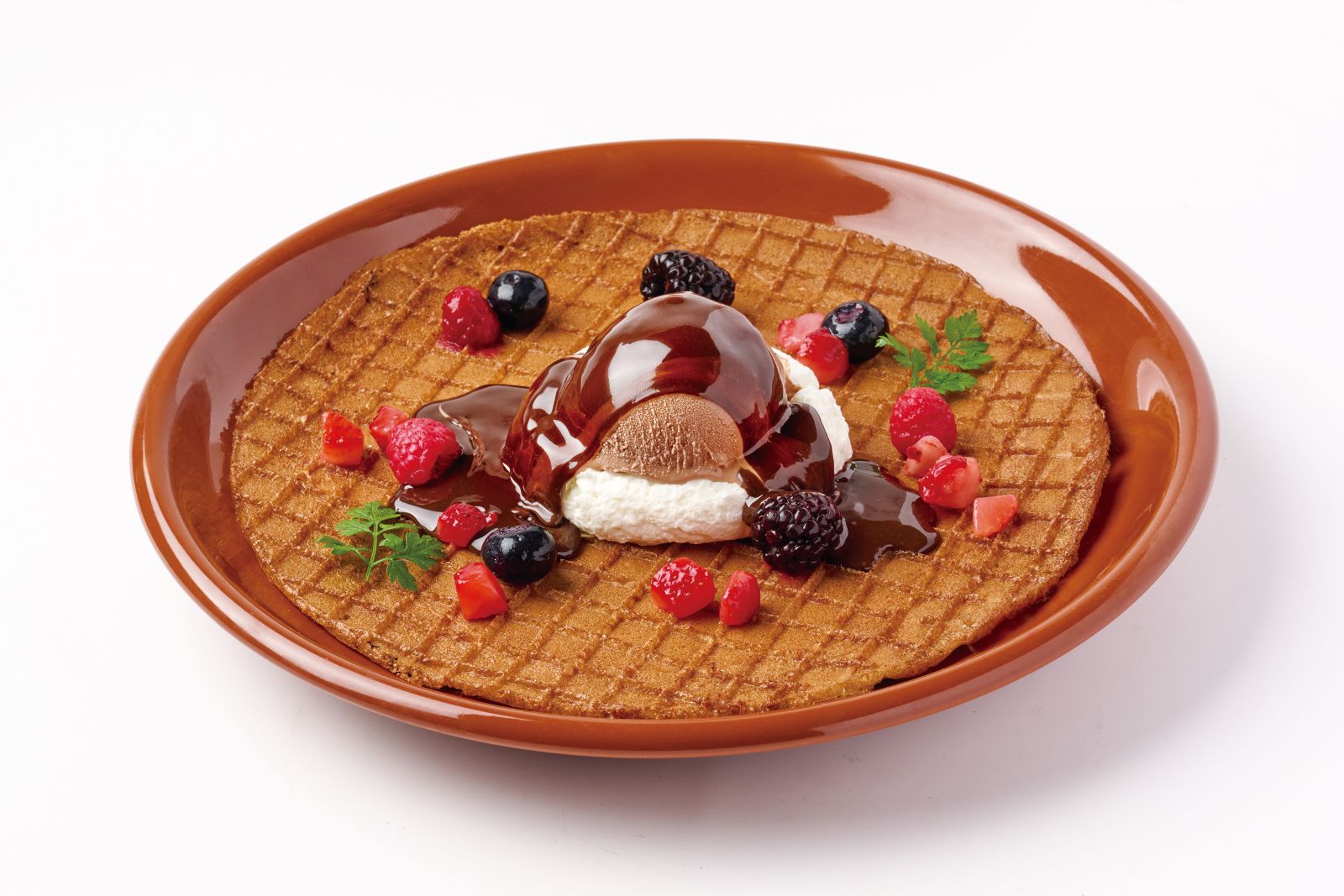限定のショコラクレール生地に、チョコレートアイス、ベルギー産クーベルチュールチョコレートソースをかけた濃厚で贅沢なクレールです。