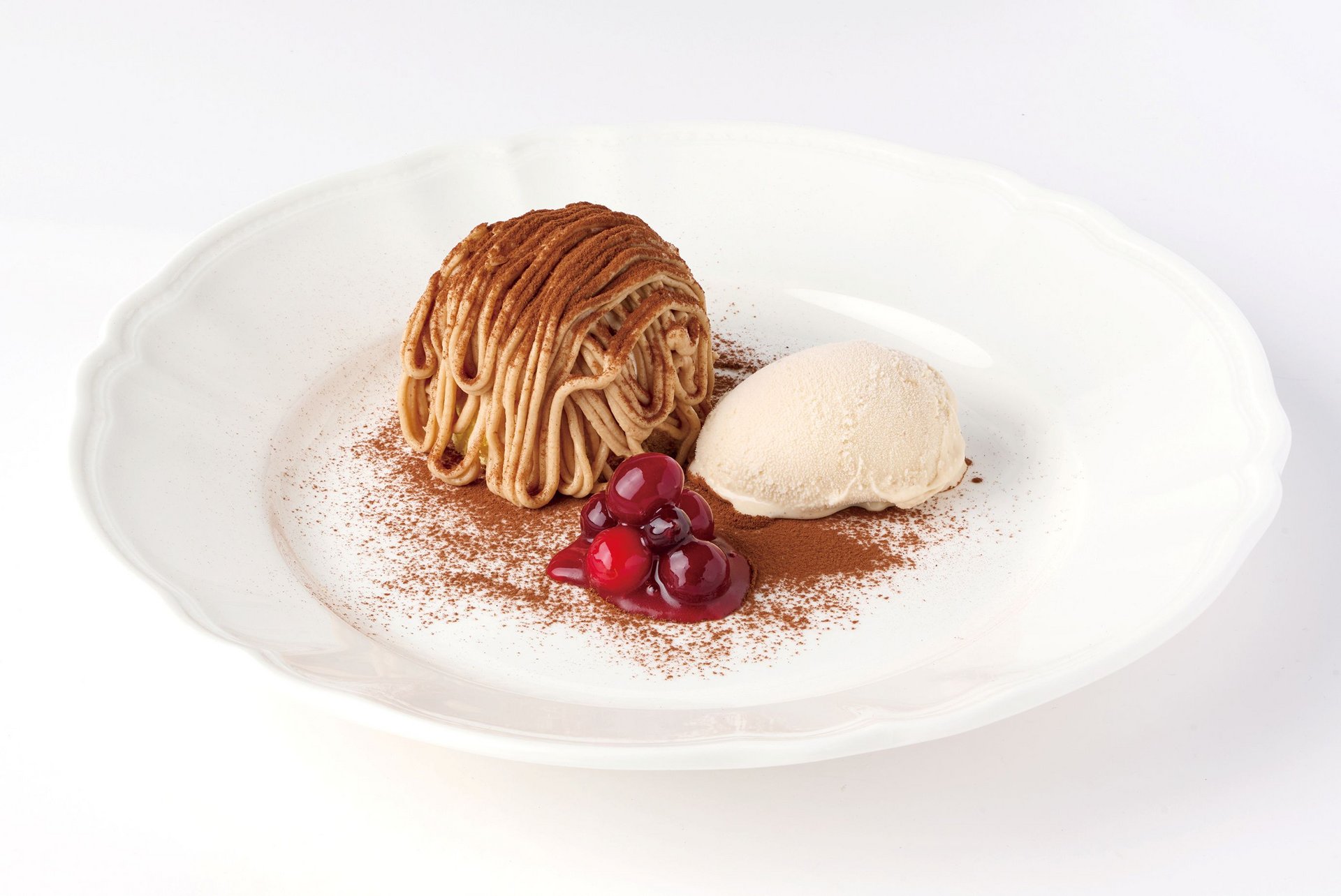 濃厚なモンブランクリームをしぼった自家製ティラミスに、マロングラッセジェラートを添えました。