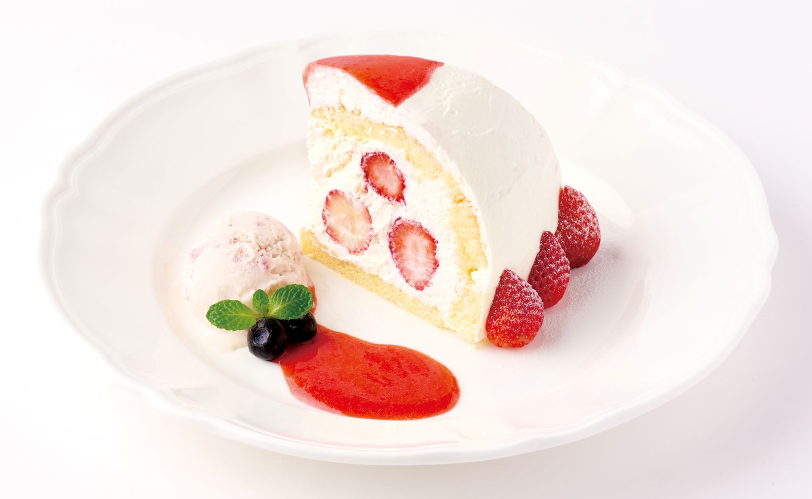 イタリア トスカーナ地方発祥のケーキ「ズコット」。 旬の苺と口どけのよいクリーム、香り豊かな苺ジェラートを添えた春の一皿です。