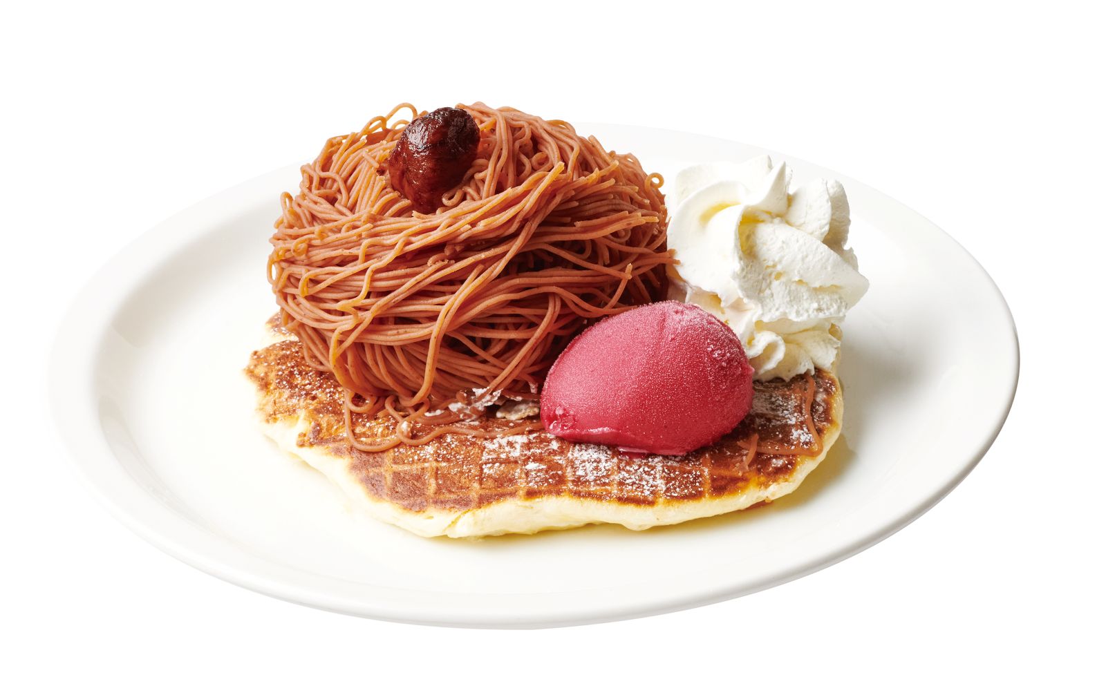 極細モンブランクリームのふんわり軽いくちどけを楽しむ季節のパンケーキ。濃厚な甘味のクリームとパンケーキ生地との相性は抜群です。