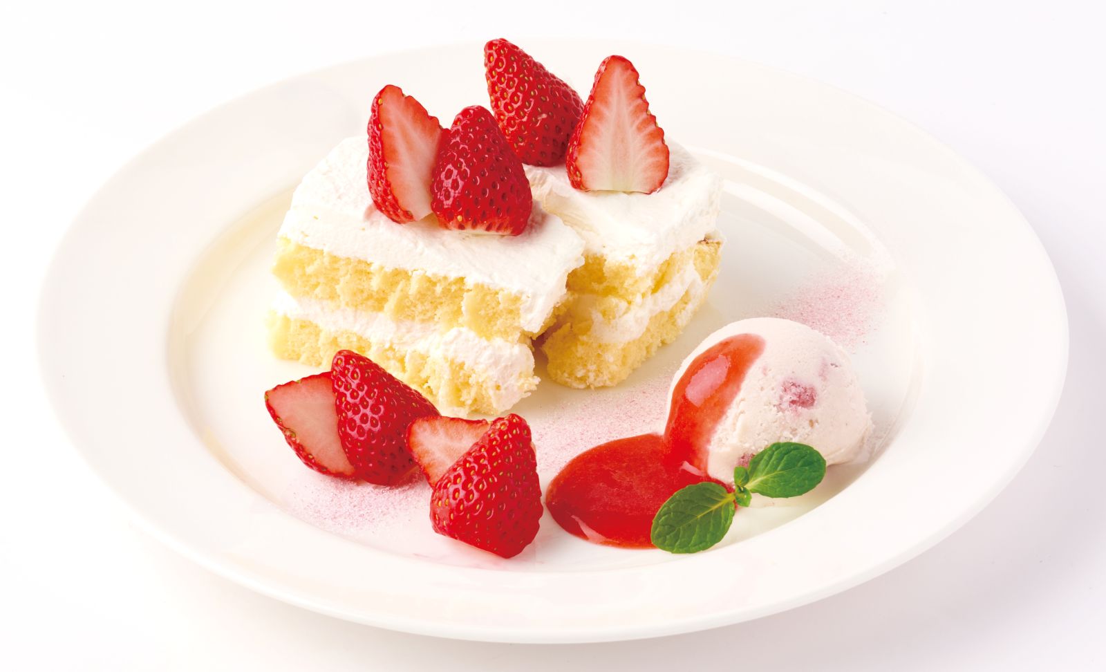 クリームとスポンジの一体感ある口どけが美味しい苺ケーキです。完熟苺アイスとともにお楽しみください。