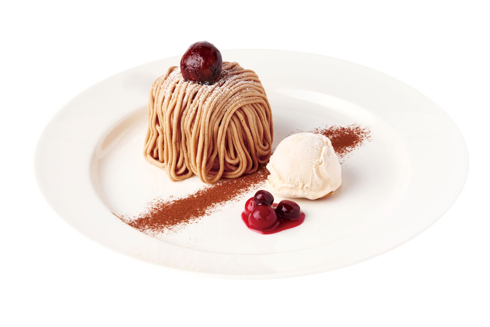 しっとりふんわり食感のモンブランケーキに、ジェラート専門店「ドルチェヴィータ」のマロングラッセジェラートを添えました。