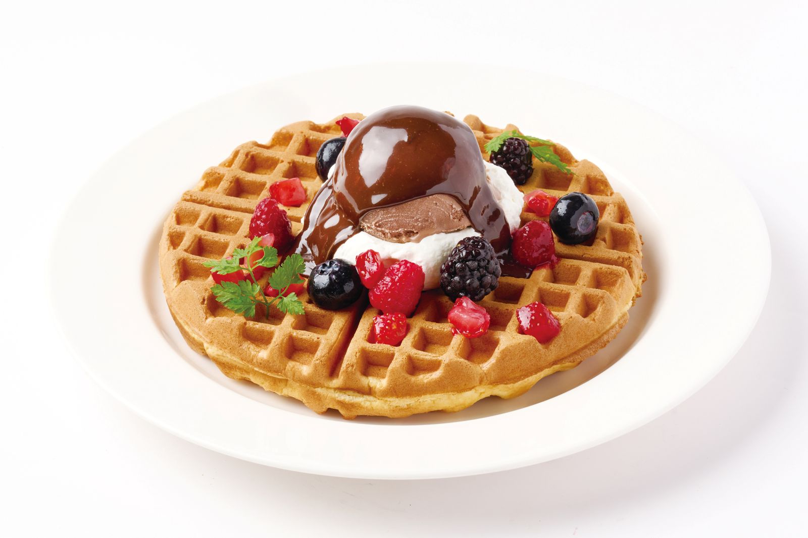 ジェラート専門店「Dolce vita」のチョコレートアイスに、ベルギー産クーベルチュールチョコレートのソースをかけた濃厚でリッチな季節のワッフルです。